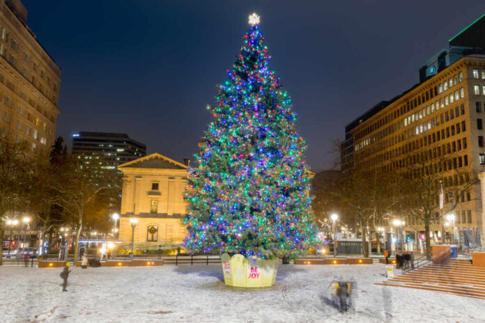 Portland’s Christmas tree shines bright in Pioneer Courthouse Square for lighting ceremony